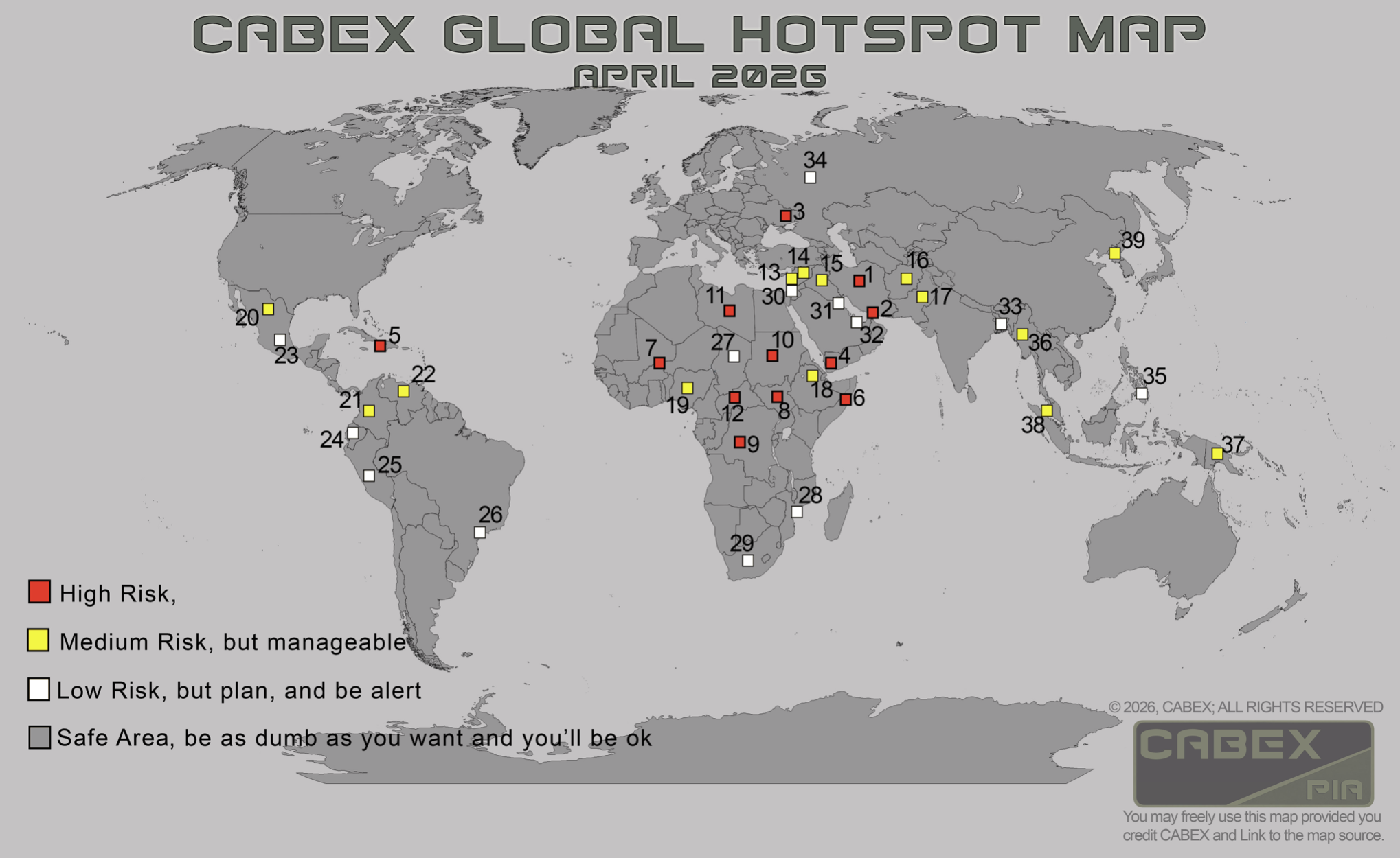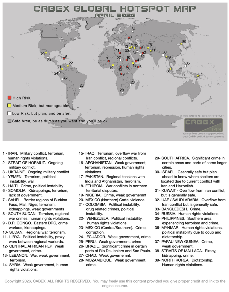 Cabex PIA provides advanced global intelligence, risk management, and threat mitigation support for government agencies, corporations, and organizations operating in unstable, high-threat, or strategically sensitive environments. Our monthly global hotspots and threats map highlights regions affected by war, terrorism, political instability, corruption, human rights violations, elevated crime, natural disasters, and other developing threats that can impact missions, assets, personnel, supply chains, and continuity of operations. This map is part of Cabex PIA’s broader suite of capabilities, including open-source intelligence, strategic risk analysis, operational briefings, protective intelligence, and comprehensive risk mitigation services tailored to each client’s operational footprint and exposure profile. For agencies and companies seeking credible intelligence support for sensitive operations, vulnerable areas, and complex decision-making, Cabex PIA delivers a high-level resource designed to strengthen situational awareness, support continuity planning, and help protect critical interests in rapidly changing environments.